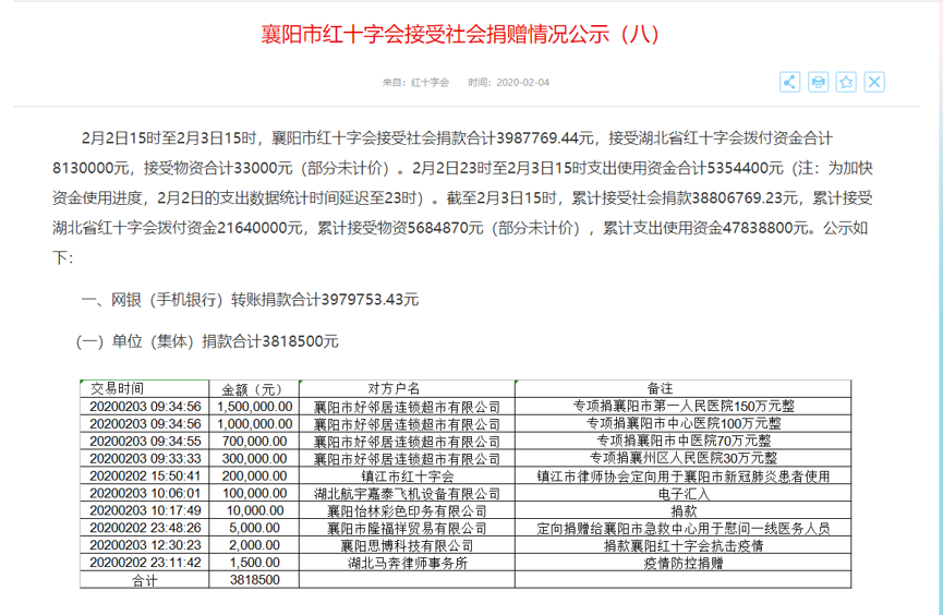 襄阳好邻居向襄阳红十字会慷慨捐赠人民币350万元整。其中,分别向襄州区人民医院捐赠30万元整,向襄阳市中医院捐赠70万元整,向襄阳市中心医院捐赠100万元整,向襄阳市第一人民医院捐赠150万元整,专项用于襄阳市新型冠状病毒肺炎防疫工作。