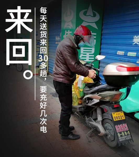 青青家园店店长王建兵,每天利用自己的电动车给顾客配送,一天至少配送30多单,要送三十多次,电动车一天要充好几次电,他笑着说:“关键时刻,还是我的小电驴好用。”