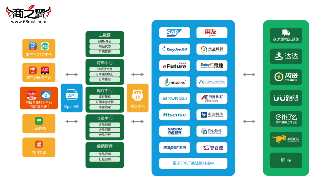商家可通过搭建商之翼线上商城系统对数据进行高效管理。商之翼目前已与各大ERP厂商达成战略合作,可以帮助商家进行接口对接、数据库对接以及对接中台的方式与您的ERP实现对接!可以帮助商家在这场疫情期间,快速完善线上线下的数据处理、订单处理以及一体化管理!