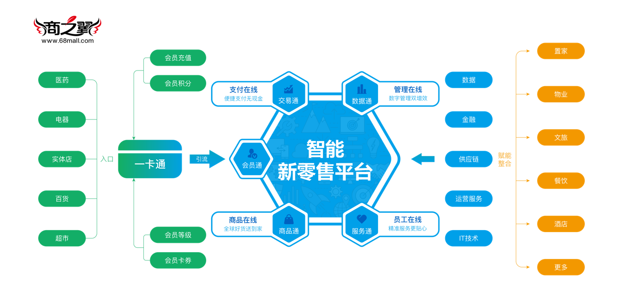 深度打通线上线下,对接的数据包含会员(会员积分+余额)、商品、订单、门店、库存。