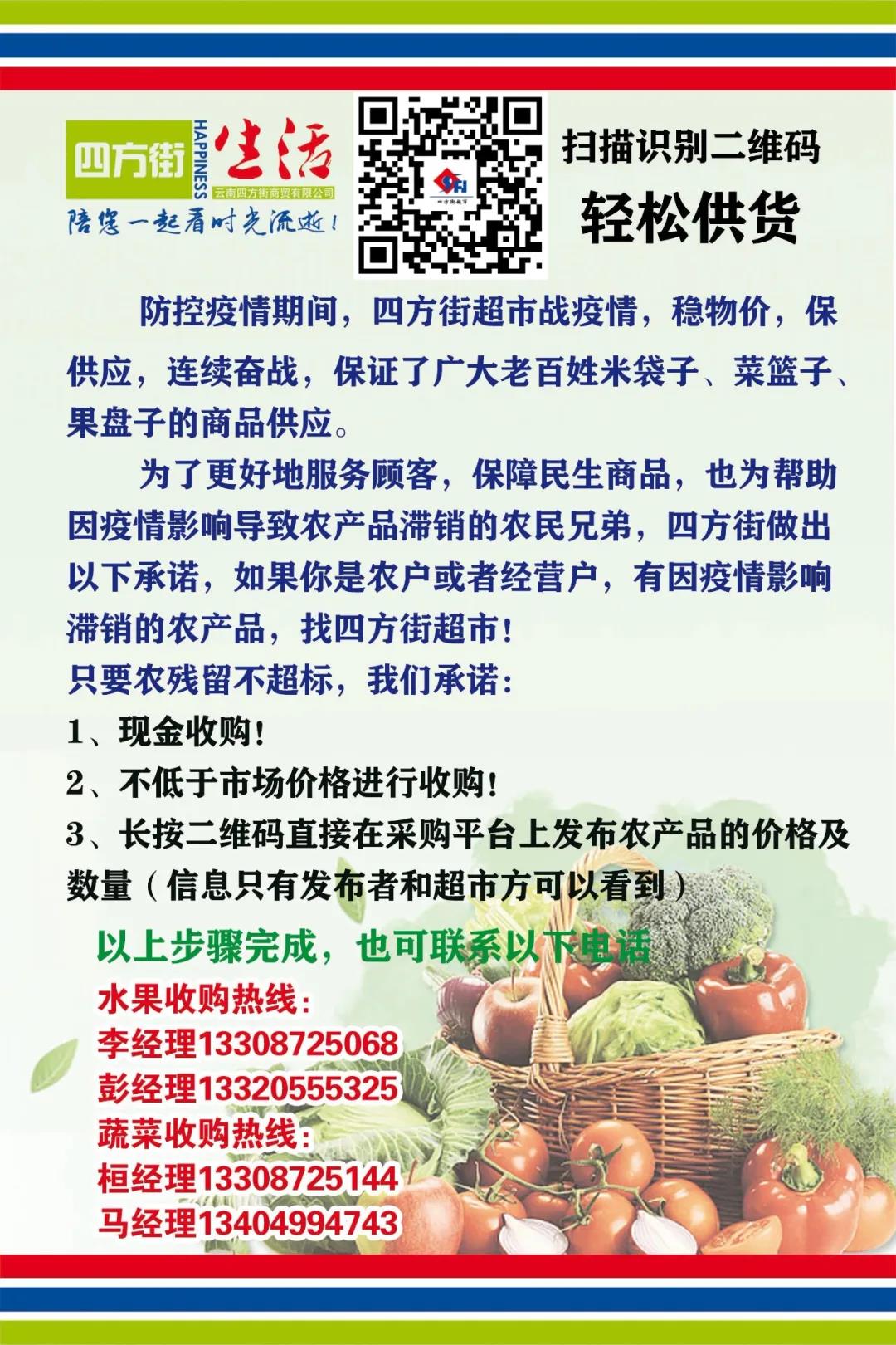 为了更好地服务顾客,保障民生商品,也为帮助因疫情影响导致农产品滞销的农民兄弟,四方街做出表示,如果你有因疫情影响滞销的农产品,找四方街超市!只要农残留不超标,我们承诺:“以市场价格收购”。