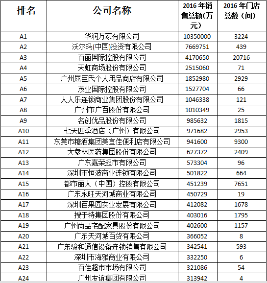 9月1日广东省连锁经营协会发布了《2016年广东连锁经营发展报告》,同时公布了2016年度广东连锁经营五十强企业榜单。据榜单显示,华润万家有限公司以1035亿元的销售总额、3224间店铺规模蝉联榜首。沃尔玛以766亿元的销售额、439间店铺规模名列榜单第二;百丽控股以417亿的销售额、20716间店铺的规模蝉联第三。相较于去年,华润万家销售额减少59亿元,同比下降5.3%;沃尔玛同比增长4.28%,增长额为315亿元;而百丽国际基本与去年持平。