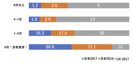 英国回答者中59%消费者都退过货。相比于此,日本则仅仅是19.4%,也许有各种各样的原因,但通过对比两国退货比例,能够看出民族特性不同。