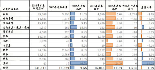 9月1日,日本面向流通零售行业从事软件开发的rhizome株式会社出版发行了日本全国商业设施和各行业租用店铺开关店动向的调查报告“2016 SC GATE报告”,开店是1.3529万家店,关店是1.5043家店,店铺总量减少1514个。