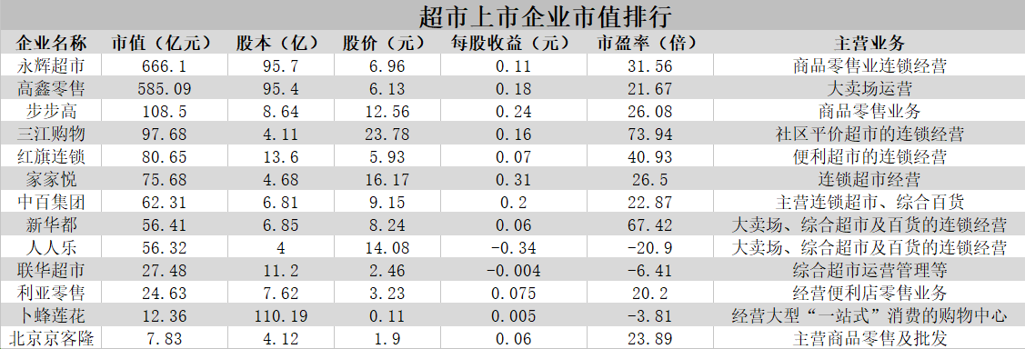 截止到2017年9月1日交易结束,14家上超市业态市企业总市值达1900.92亿元,总股本379.58亿,其中永辉超市、高鑫零售分别以市值666.1亿元、585.09亿元人民币遥遥领先。...