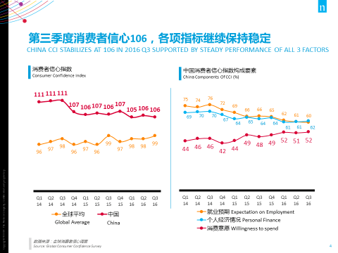 民族自信的提升,对零售企业带来直接影响的就是消费信心指数的不断提升“居高不下”。中国市场的消费者信心指数从2014年到现在,一直都是超越100%的。虽然在2014年第三季度,经济上有过一些波动,但是在2016年的9-10月份,这一数字又回调到了106%。这说明我们国家的消费者目前是保持着蓬勃积极的态势。并源源高于全球平均水平。