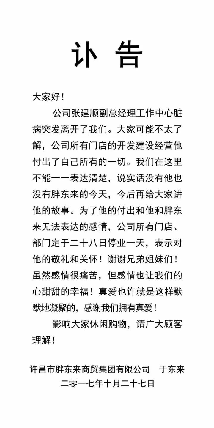 公司张建顺副总经理今天(26日)工作中心脏病突发离开了我们、大家可能不太了解、公司所有门店的开发建设经营、他付出了自己所有的一切、我在这里不能一一表达清楚、今后再给大家讲他的故事、为了他的付出和他和胖东来无法表达的感情、公司所有门店、部门定于二十八日停业一天、表示对他的敬礼和关怀!谢谢兄弟姐妹们!……虽然感情很痛苦、但感情也让我们的心甜甜的幸福!……真爱也许就是这样默默地凝聚的、感谢我们拥有真爱!