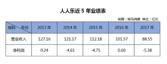 为了断臂求生,人人乐进入关店大潮,仅2014-2015年间就关闭了31家门店,同时公司通过出售资产进行回血,使2016年扭亏为盈。然而,这并非长久之计,2017年的业绩证明了这一点,2017年净利润亏损5.38亿元,达历年最高。