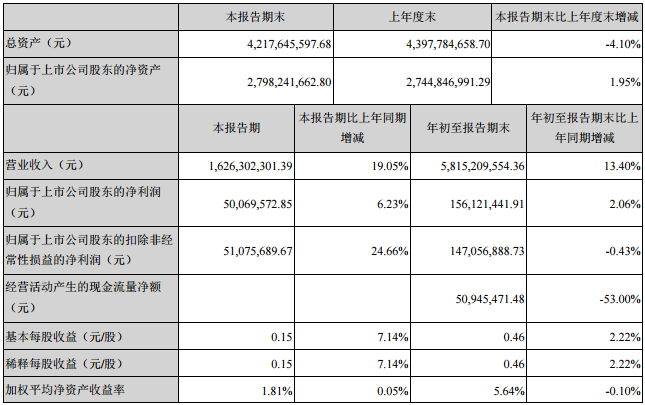 报告显示,广百股份第三季度营业收入为16.26亿元,比上年同期增长19.05%;归属于上市公司股东的净利润为5007万,比上年同期增长6.23%;归属于上市公司股东的扣除非经常性损益的净利润为5108万,比上年同期增长24.66%。