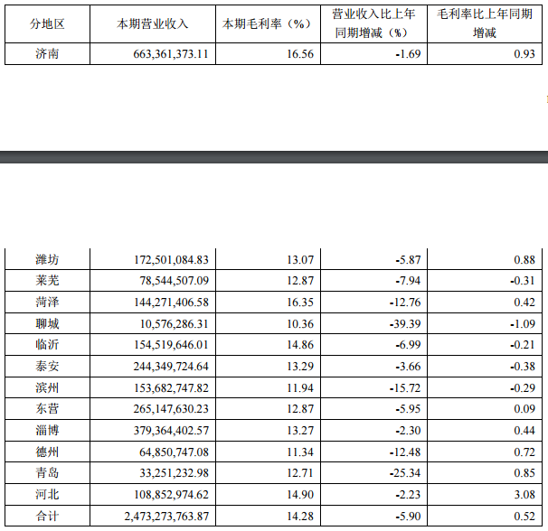 按经营业态分,百货商场第三季度营收为1527378281.37元,比上年同期减少6.76%,毛利率为13.53%,比上年同期增长0.47%;大型综合超市营收为778695062.10元,比上年同期减少4.42%,毛利率为13.21%,比上年同期增长0.08%;购物中心为167200420.40元,比上年同期减少4.79%,毛利率为26.09%,比上年同期增长2.97%。