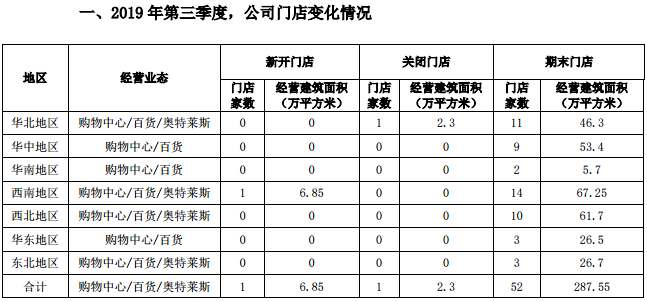 第三季度,王府井于西南地区新增1家建筑面积为6.85平米的购物中心/百货/奥特莱斯,同时华北地区关闭1家建筑面积为2.3万平方米的购物中心/百货/奥特莱斯。