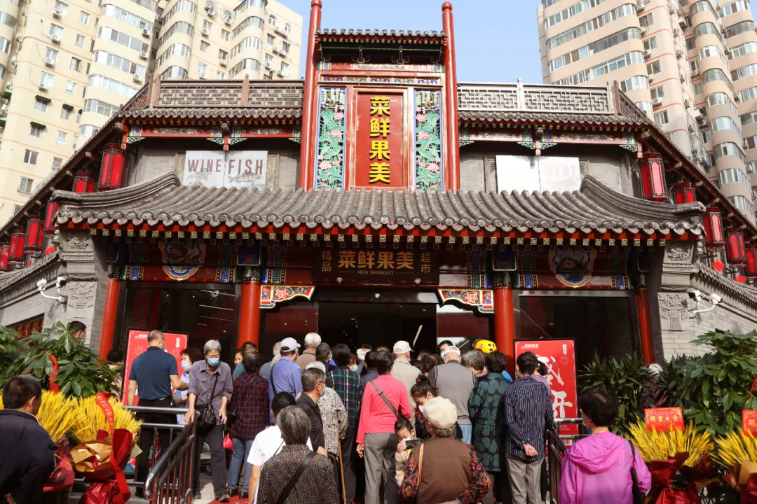 菜鲜果美作为3.0门店的范本,从以上四个方面进行了迭代。购物环境方面,安苑路店的前身为北京某知名餐饮连锁品牌总店,菜鲜果美接手该地后,在外部装修上沿袭了原来古典的建筑风格,内部采用“新中式”设计,简洁明亮。王兴水表示,菜鲜果美在升级迭代的过程中尽可能的保持了原区域的建筑风格,这样不仅节省了节省部分成本,也保留顾客对原址的记忆,增加门店在顾客心中的熟悉感。
