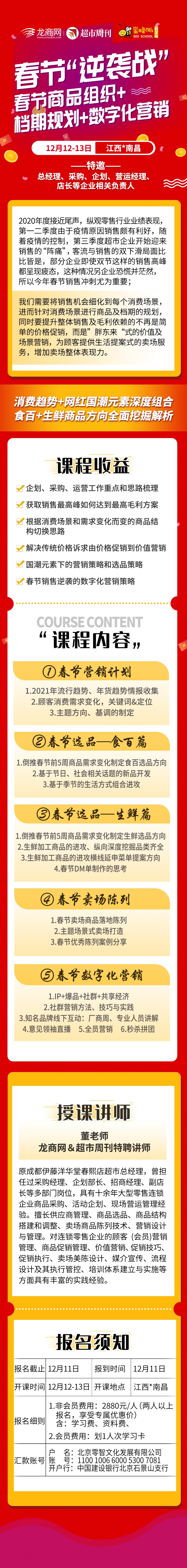主讲董老师不仅会系统介绍2021年春节商品流行特点、年货趋势情报信息,还会具体讲授年节期间企划、营运、采购的工作重点和思路梳理,如何从单纯的价格营销到深入顾客心的价值营销,生鲜、杂货、非食各品类的爆款选品以及商品组合及营销策略,卖场商品布局与陈列的年节调整案例等,比如年节销售高峰期如何取得高毛利,年节DM单制作以及数字化营销的实施方案等实战案例。