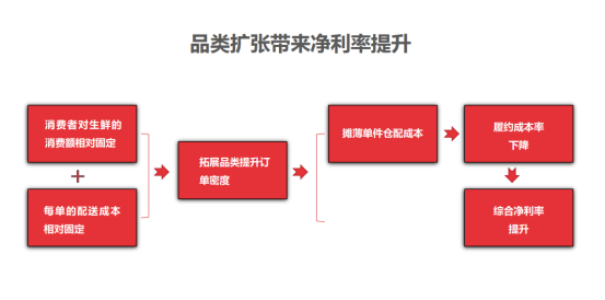 实践中,社区团购平台将生鲜作为核心品类,同时进行多品类多SKU扩张,这既解决了引流品类生鲜商品订单密度有限且毛利率低进而影响总体盈利的难题,又丰富了SKU;扩充品类不仅满足了消费者的更多需求,同时提升了平台订单密度(降低履约费用率)与综合毛利率,是平台实现盈利的必然举措。