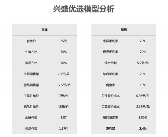 我们的测算结果显示,生鲜销售额占比小于35%平台可实现盈利。来自兴盛优选的数字也很好地佐证了这一结论: