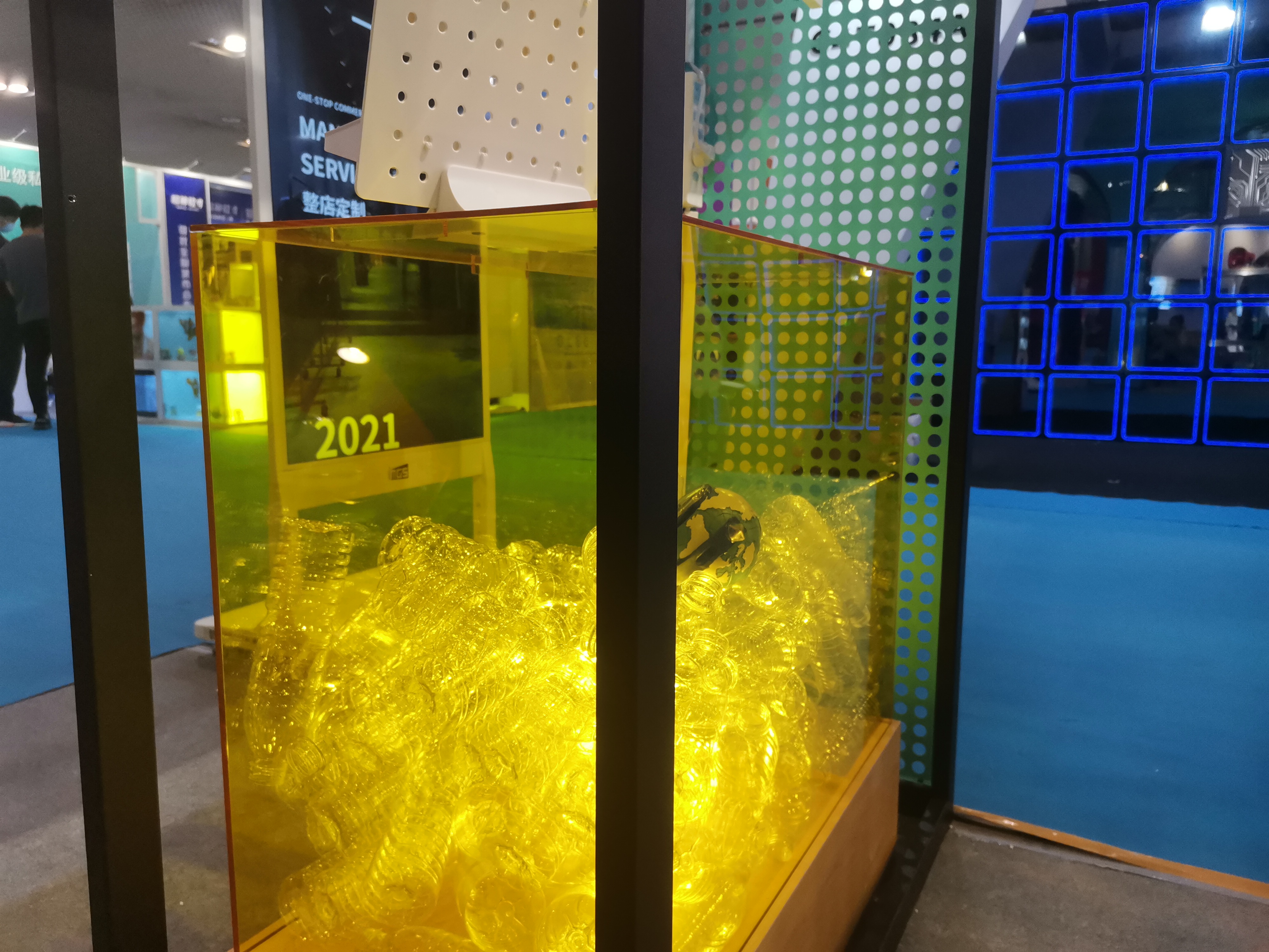 基于需求端的变化,本次展览谊瑞更多是想要传达商业空间设计方面的一些概念:一是通透、空灵的空间感,通过各个拱门形状分割成几个不同的空间,用来展示鞋服、珠宝、化妆品等不同零售形态的展示;二是主要以网红打卡的形式展出,巧妙运用旧报纸、矿泉水瓶来装饰设计,既传达出当下备受推崇的环保理念,又能赋予废品以美感;三是透明橱窗的应用,对外为显示屏,对内则是不影响采光的橱窗,尽可能多地增加与顾客连接的机会。