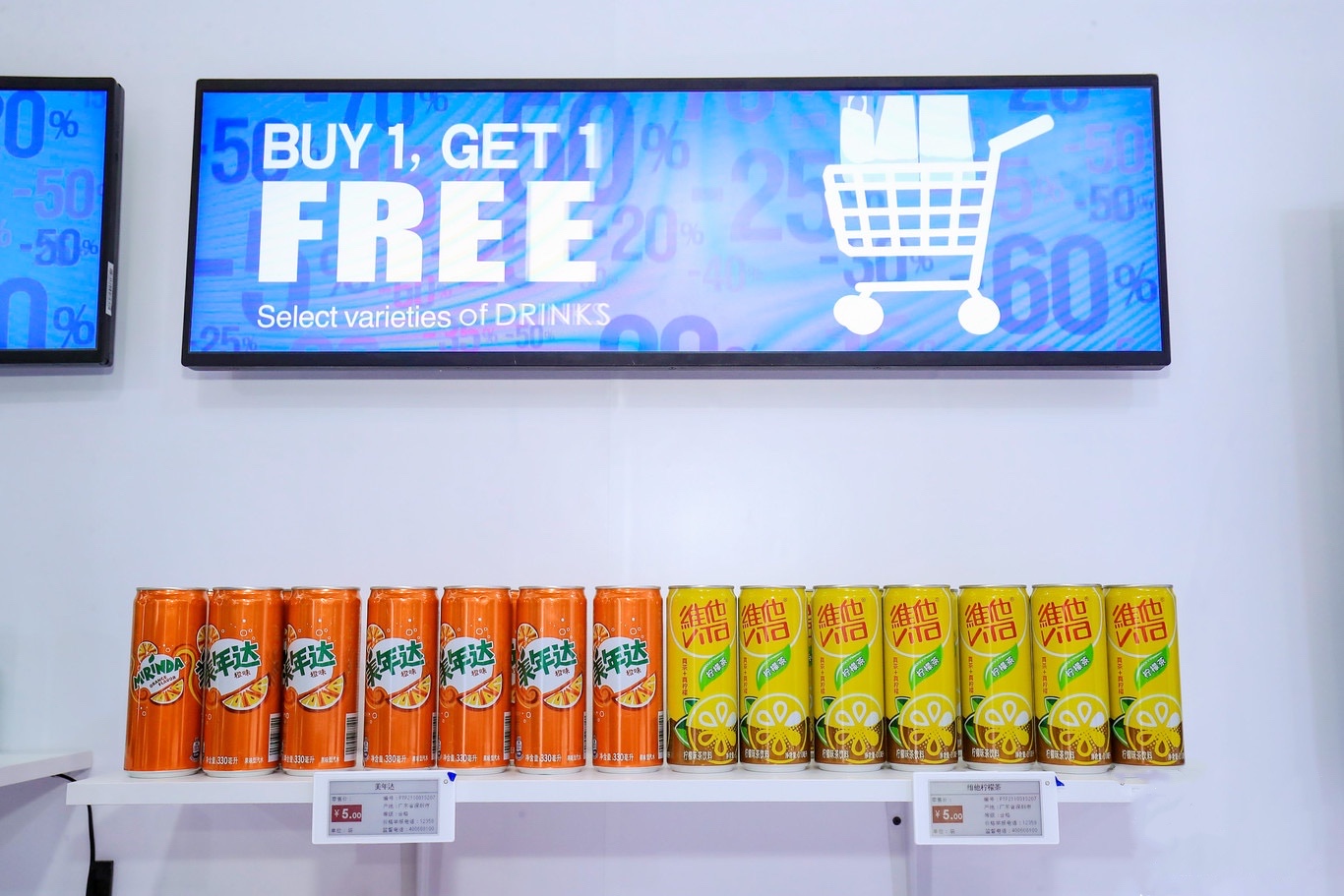 数字化营销方面,不同尺寸的Lcd屏幕分布在门店的各个部分,如门口的迎宾屏、端架屏、货架横切面的条屏、货架顶端的生鲜屏,不同方位不同大小不同内容,使整个卖场更为生动、形象,营销信息也一目了然。其中,主推产品是专为生鲜场景打造的Lumina系列价签及其营销屏,支持全彩动态播放,可辅助商家或品牌方进行创意陈列和主推产品广告播放,有效刺激消费,提振销量,降低损耗。