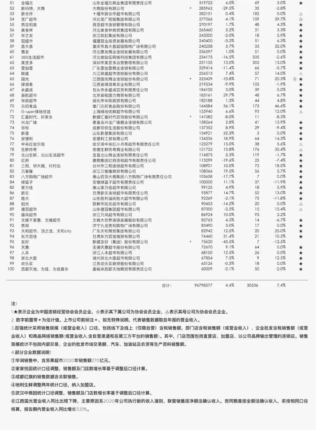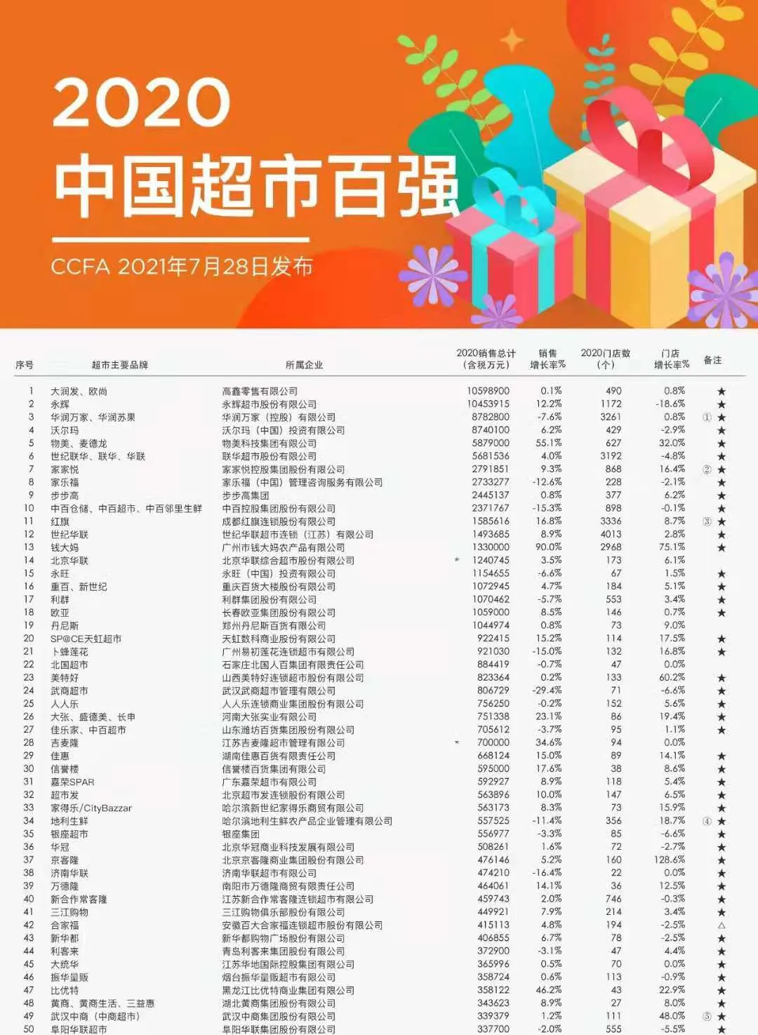 取代2019年榜首的华润万家,2020年超市百强榜上,高鑫零售、永辉双双突破千亿大关。