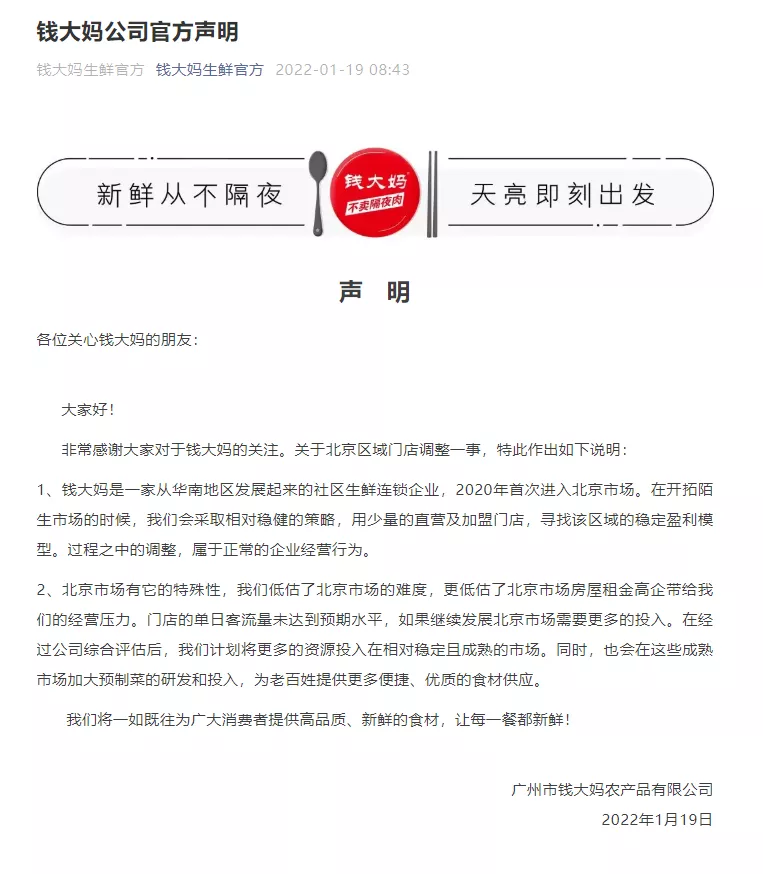 2022年1月19日,钱大妈官微发布声明:“我们低估了北京市场的难度,更低估了北京房屋租金高企带给我们的经营压力”,“门店的单日客流量未达预期水平,如果继续发展北京市场需要更多的投入”,“在经过公司综合评估后,我们计划将更多的资源投入在相对稳定且成熟的市场”。