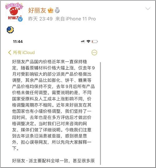 3月1日晚,该公司在官微发布一张图片,回应涨价以及配料问题,其中写道“不同国家受原料和人工成本上涨影响不同,近年来好丽友在全世界其他国家也做过价格调整”,还称不存在配料“双标”,相关争议是翻译问题。