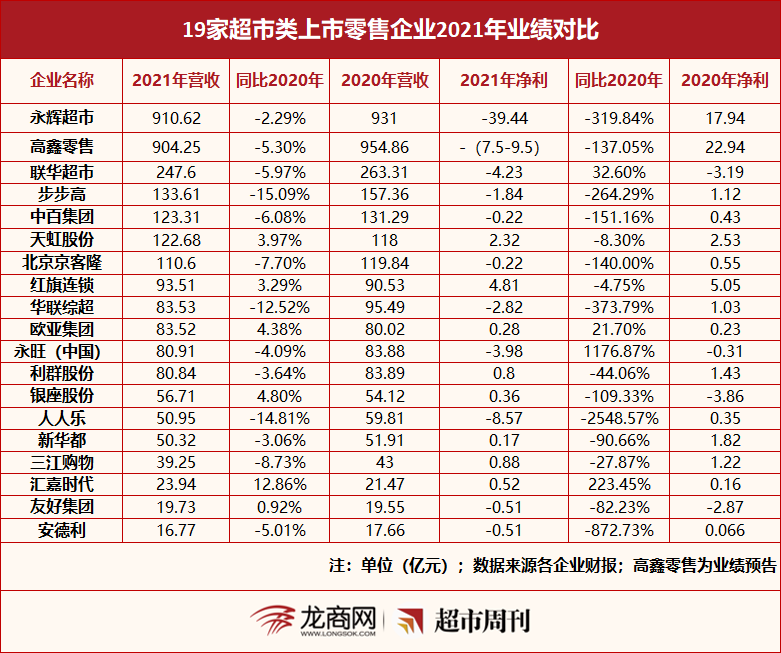 龙商网&超市周刊统计2021年零售企业上市公司财报发现,19家企业中13家营收下滑,11家亏损;其中永辉超市亏损39.44亿元,高鑫零售亏损7.5-9.5亿元,人人乐亏损8.57亿元,联华超市亏损4.23亿元……