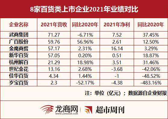 比如广百股份,2021年实现营业收入59.76亿元,同比增长56.96%;净利润2.61亿元,增长12.5%。广百股份在年报中披露,将积极调整经营模式、购销自营的销售收入同比增加,中、高端消费需求增加。