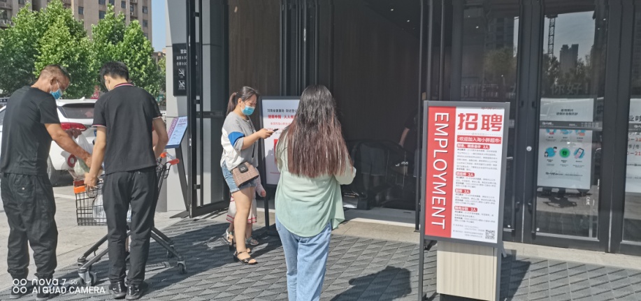 超市门口服务人员在提示大家扫码进店,主动帮助购买商品多的顾客接送电梯到外面,并和进入的顾客热情打招呼。