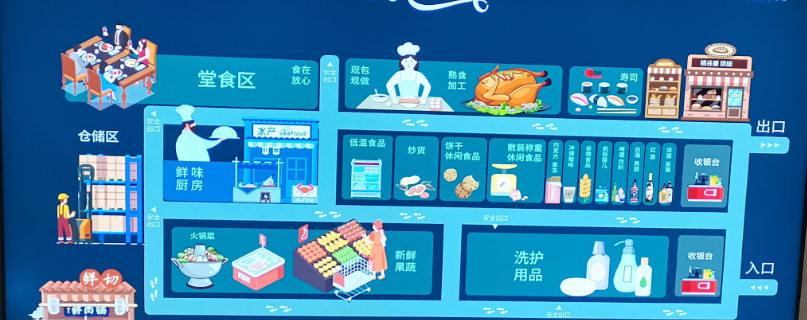 后面有加工区和堂食区域,提供海鲜加工服务。熟食和加工面点区域围绕卖场动线设计,后面都有独立的明档加工间,休食和酒饮在卖场中心,日配冷藏区在U型环线内侧,设计主动线清晰,几乎没有死角区域。