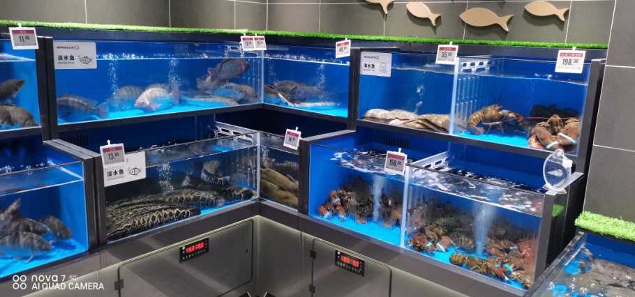 肉禽区域在卖场最深处做引流,冷藏柜展示猪肉分割、联营猪肉、湘佳鸡和调理制品。水产部门紧挨着肉禽区域,单独一个水产的售卖区域,以活鲜为主。