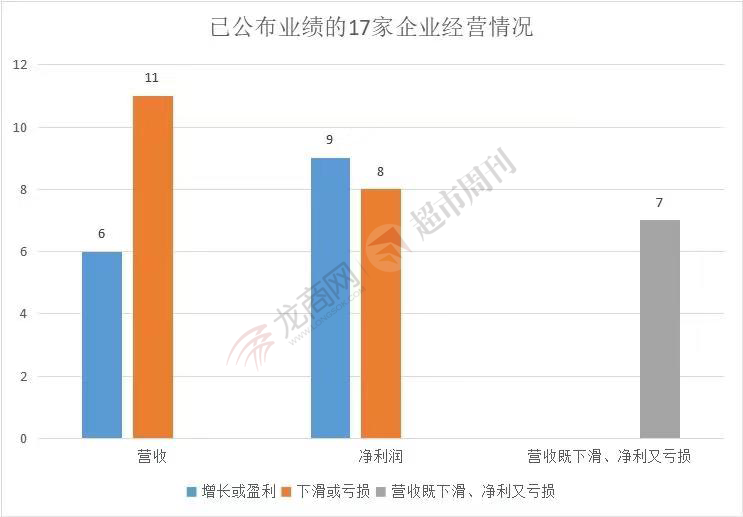 已公布业绩的17家企业,11家营收下滑,人人乐、中国顺客隆、北京京客隆、世纪金花、茂业商业等;8家亏损,人人乐、中国顺客隆、岁宝百货、南宁百货等;营收下滑又亏损的企业有7家。