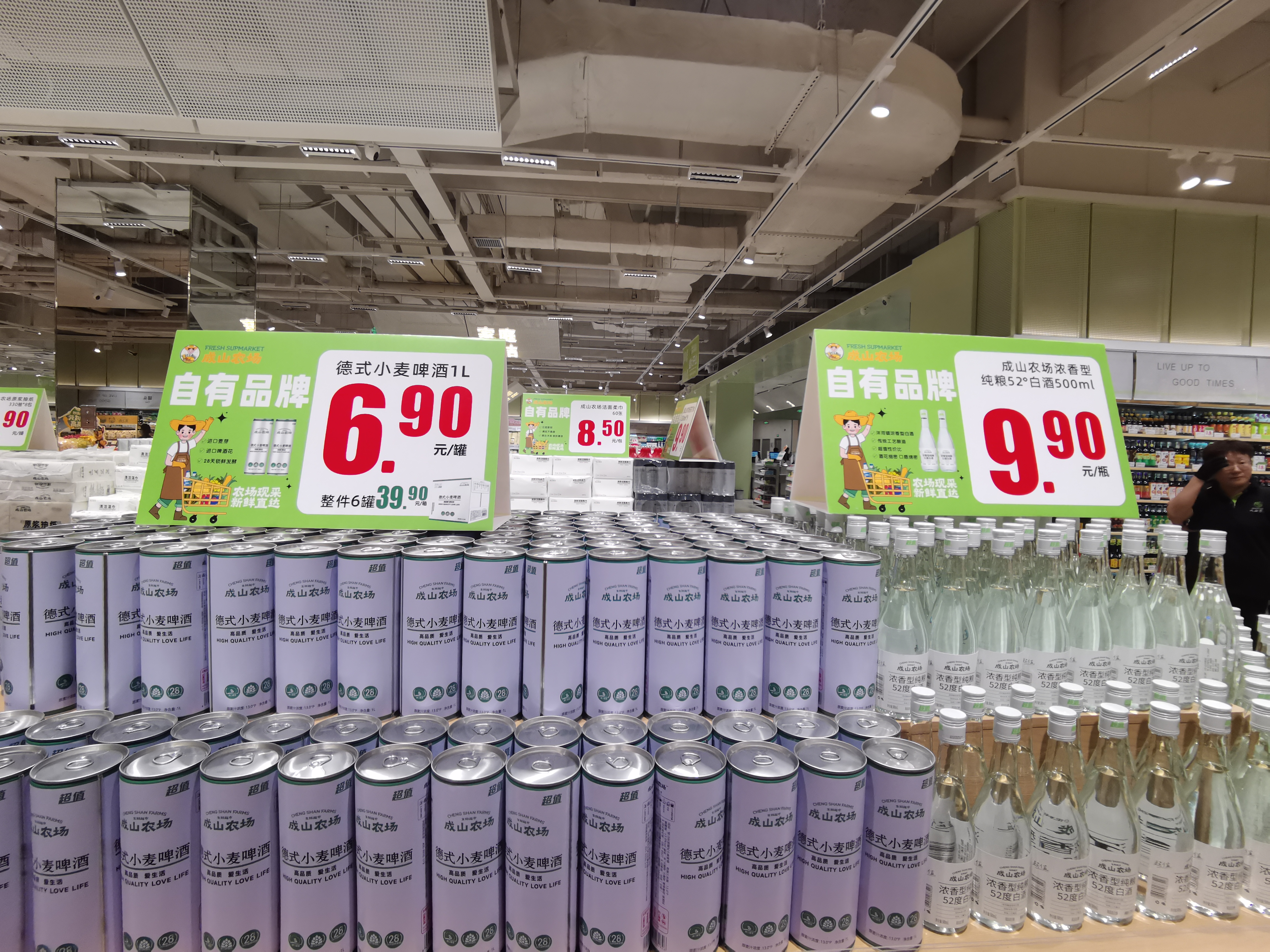 今年3月,成山农场启动了自有品牌项目,至今累计开发了20多支单品,涵盖酒饮、果汁、纸品、豆制品、玉米等品类。截至目前,其多家门店已经上线相关单品,而刚开业的未央天街店引进自有品牌单品最多、最齐全,共计10多款。
